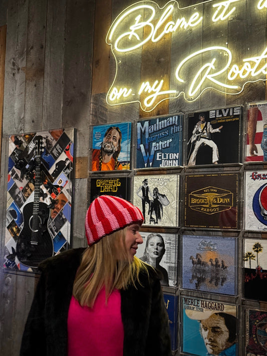 Pink & Red Striped Chunky Knit Beanie