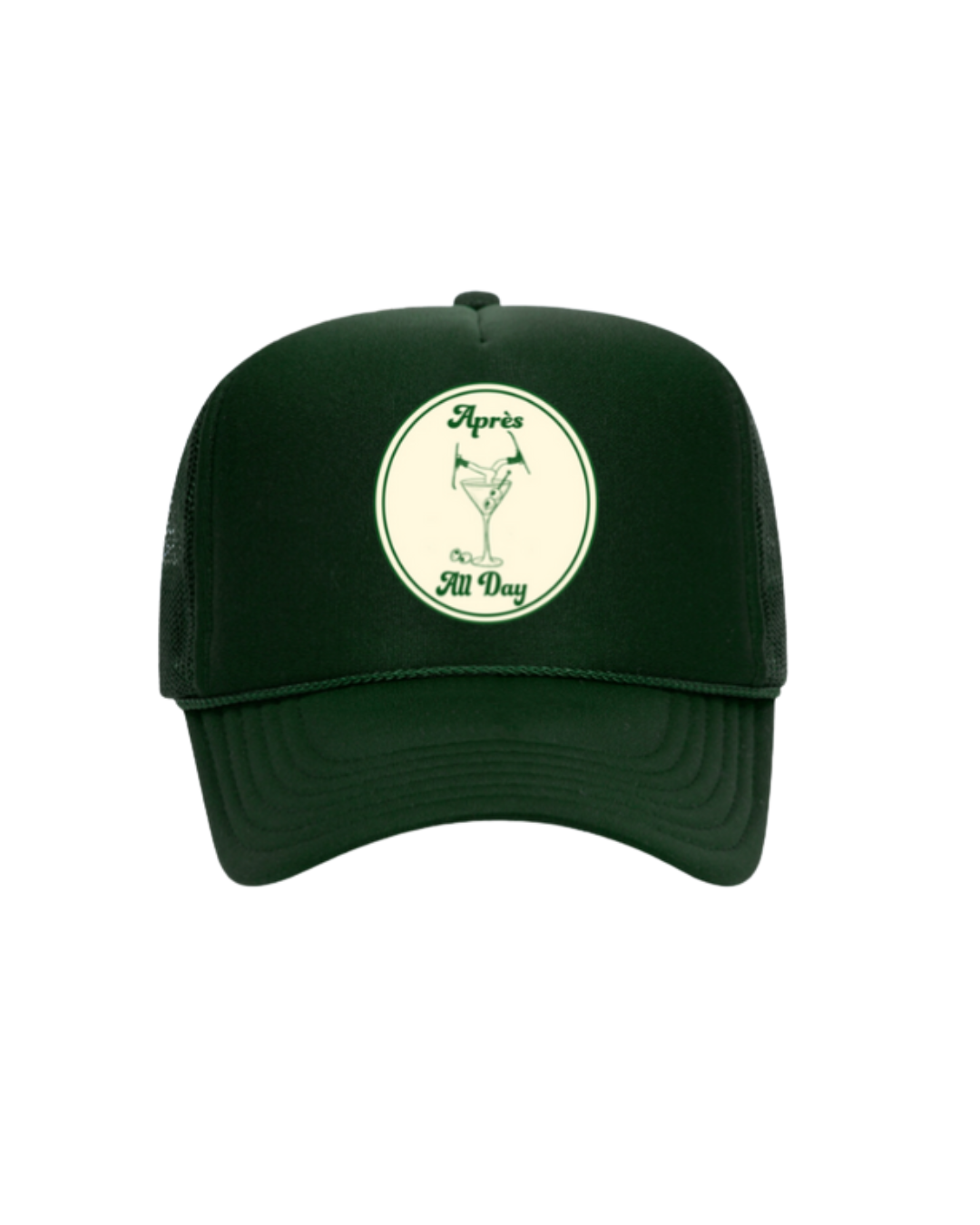 Featuring a white patch with forest green embroidery on a forest green base, structured 5-panel fit, breathable mesh back, and a pre-curved brim, this hat lets everyone know that you can apres whenever you feel like it.