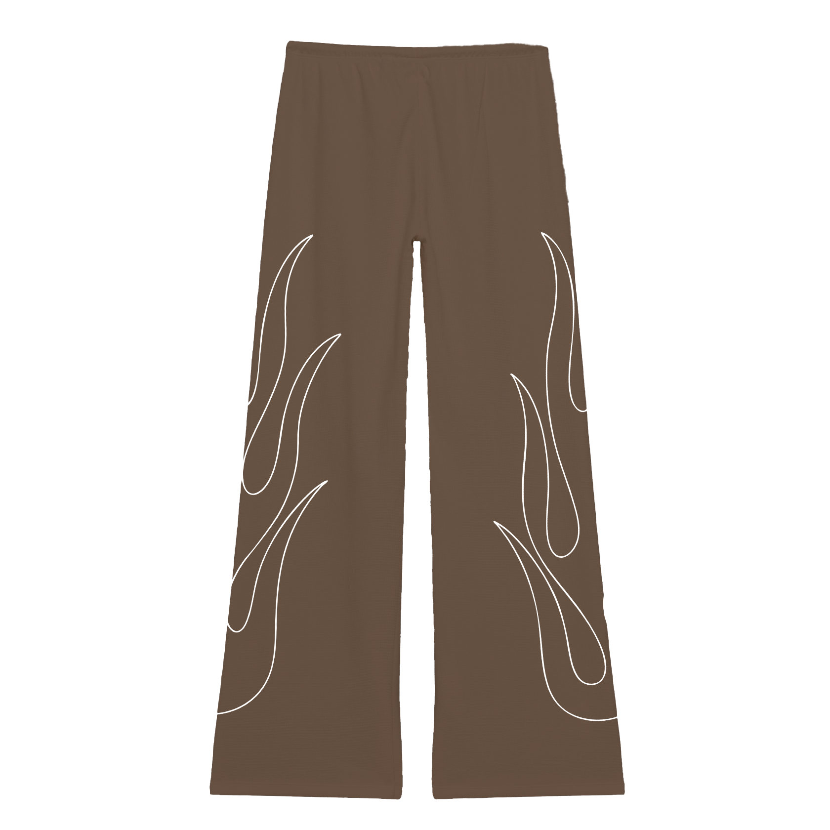 Brown waffle knit pants designed with a relaxed, easy fit and white flame linework running down both legs. Made from a soft, breathable waffle fabric with natural stretch, these pants offer cozy warmth without feeling heavy. Finished with an elastic waistband and available in both Regular and Tall lengths for your ideal fit.