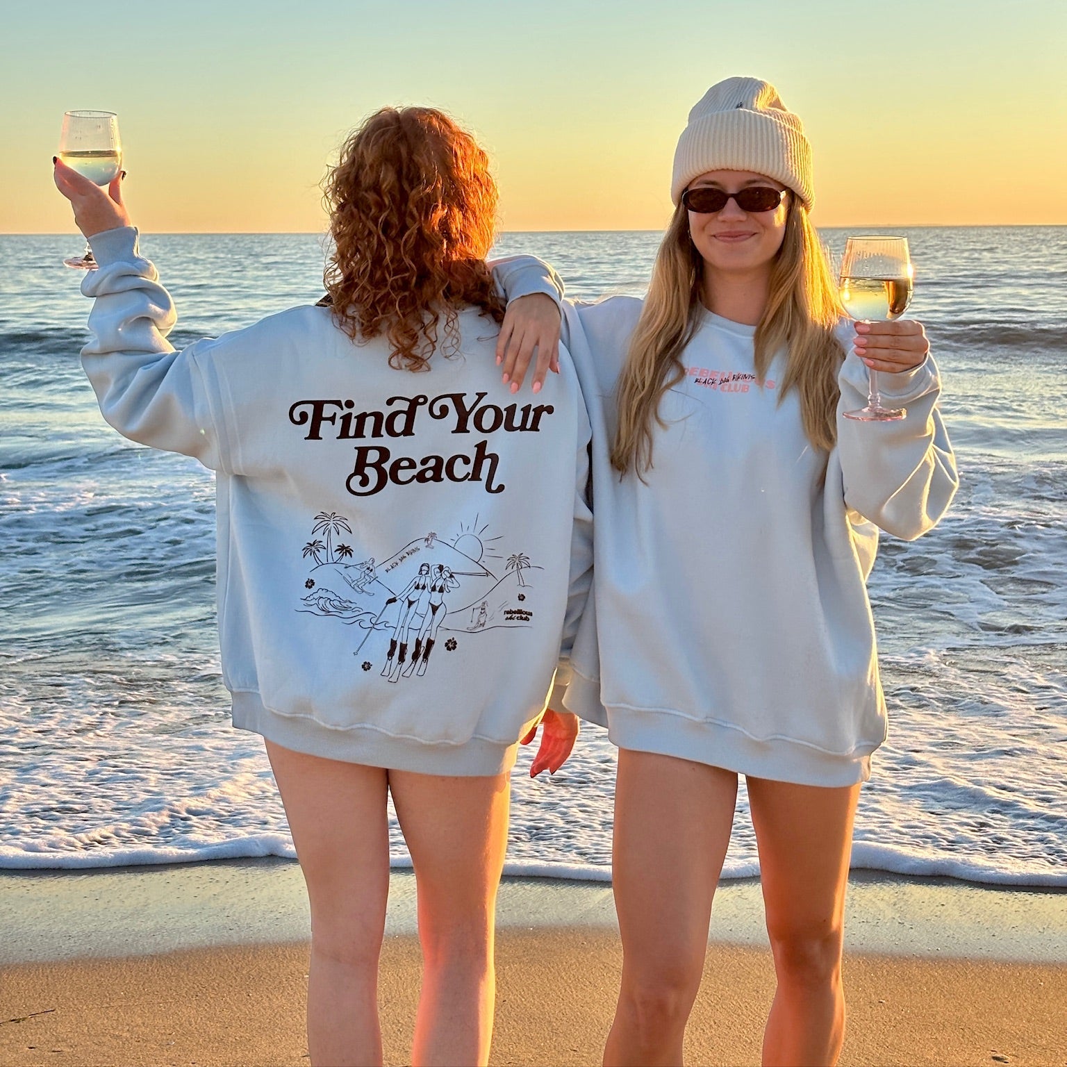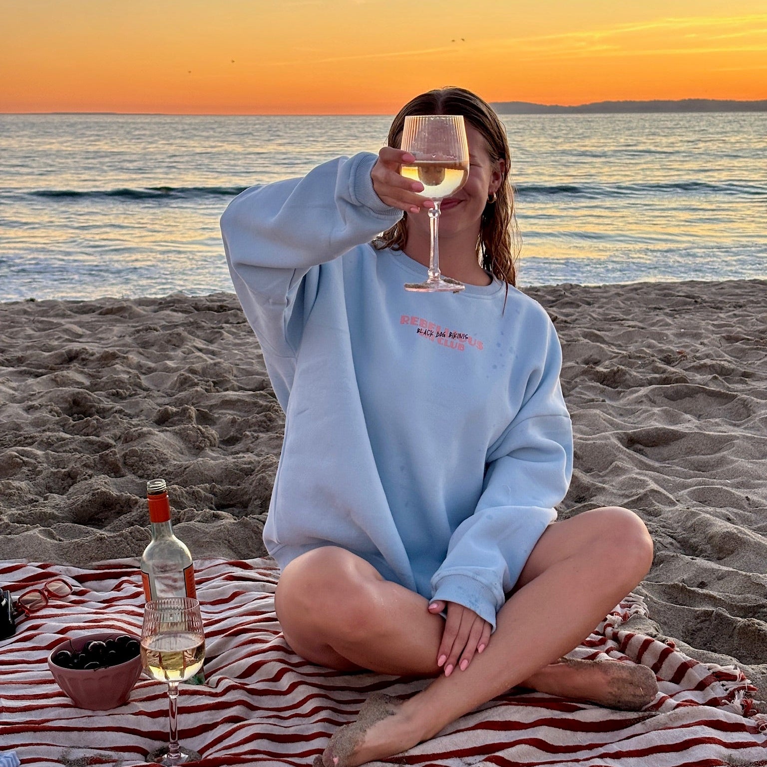 This light blue crewneck features a deep maroon “Find Your Beach” graphic across the back, with a hand-drawn beach scene and surf-girl energy that feels straight out of a dream vacation. The front is finished with a subtle Raw & Rebellious x Black Dog Bikinis hit, making it the perfect laid-back statement piece. Designed in a relaxed, oversized fit with soft, luxe, heavyweight fabric, it’s made for sunrise walks, post-swim coffee runs, and every chill moment in between.