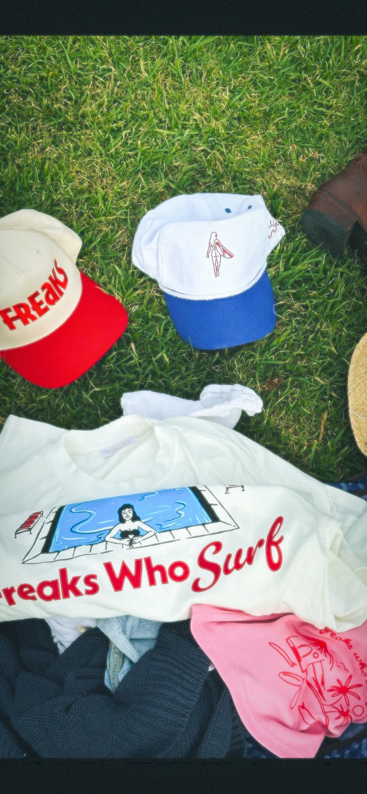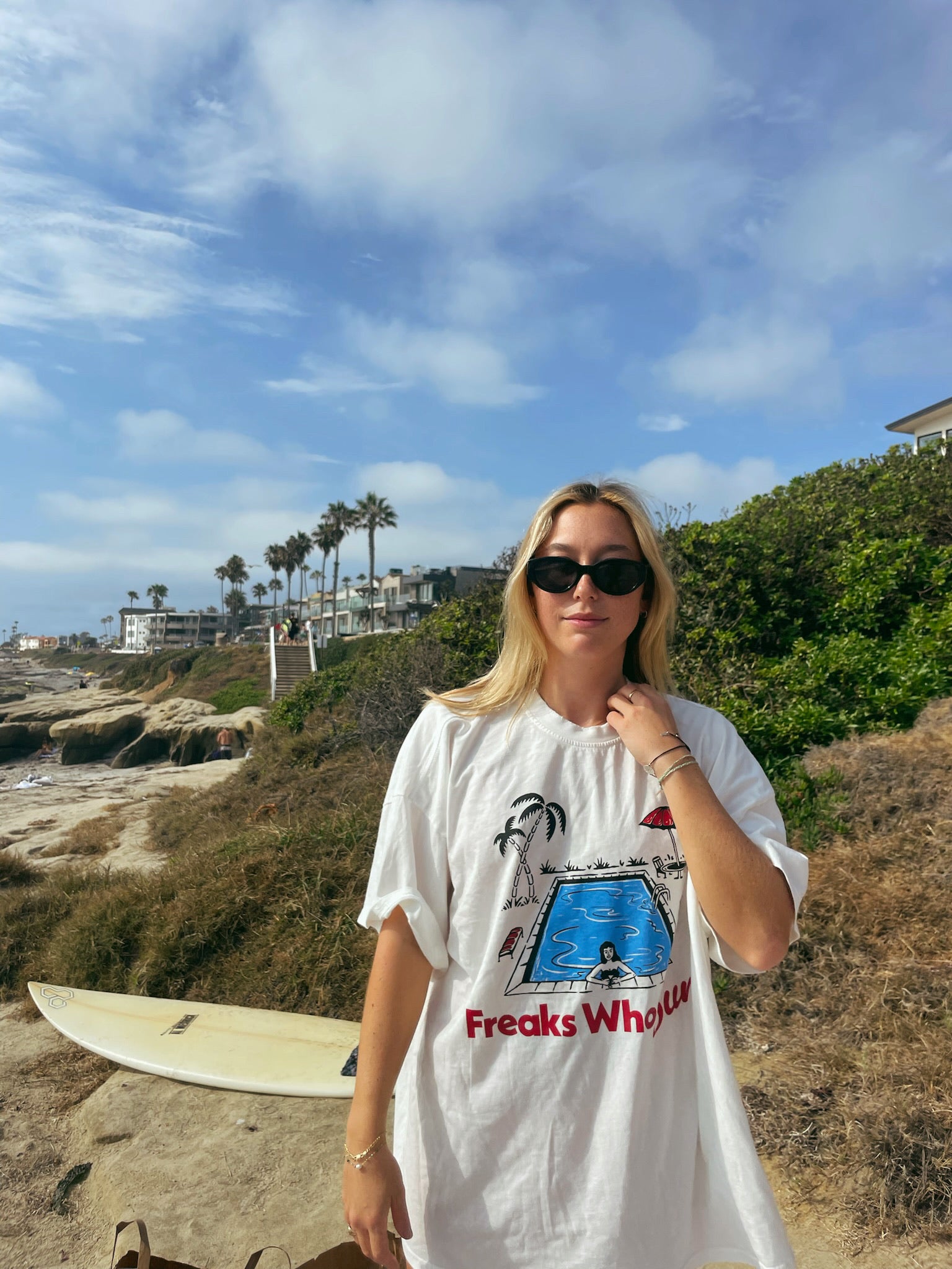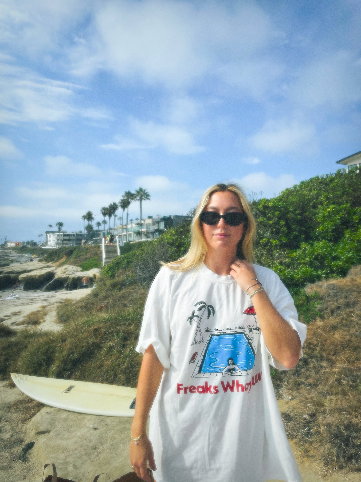 Our oversized t-shirts are the perfect staple for your cozy, comfy aesthetic. Handcrafted with breathable, cotton fabric, you'll absolutely live in this top. This t-shirt is white, with our "Freaks Who Surf" graphic screen printed on the front. Back of tshirt Is blank. Available in various sizes; quality details, and fit details below.
