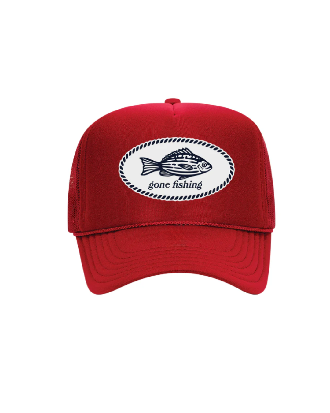 Classic Americana energy with a cheeky twist. The “Gone Fishin’” hat reels it in with a fire red foam front, vintage-style art, and crisp white mesh for full bait shop babe vibes. Built with a 5-panel structure, curved brim, and embroidered patch for low-effort, high-impact style.