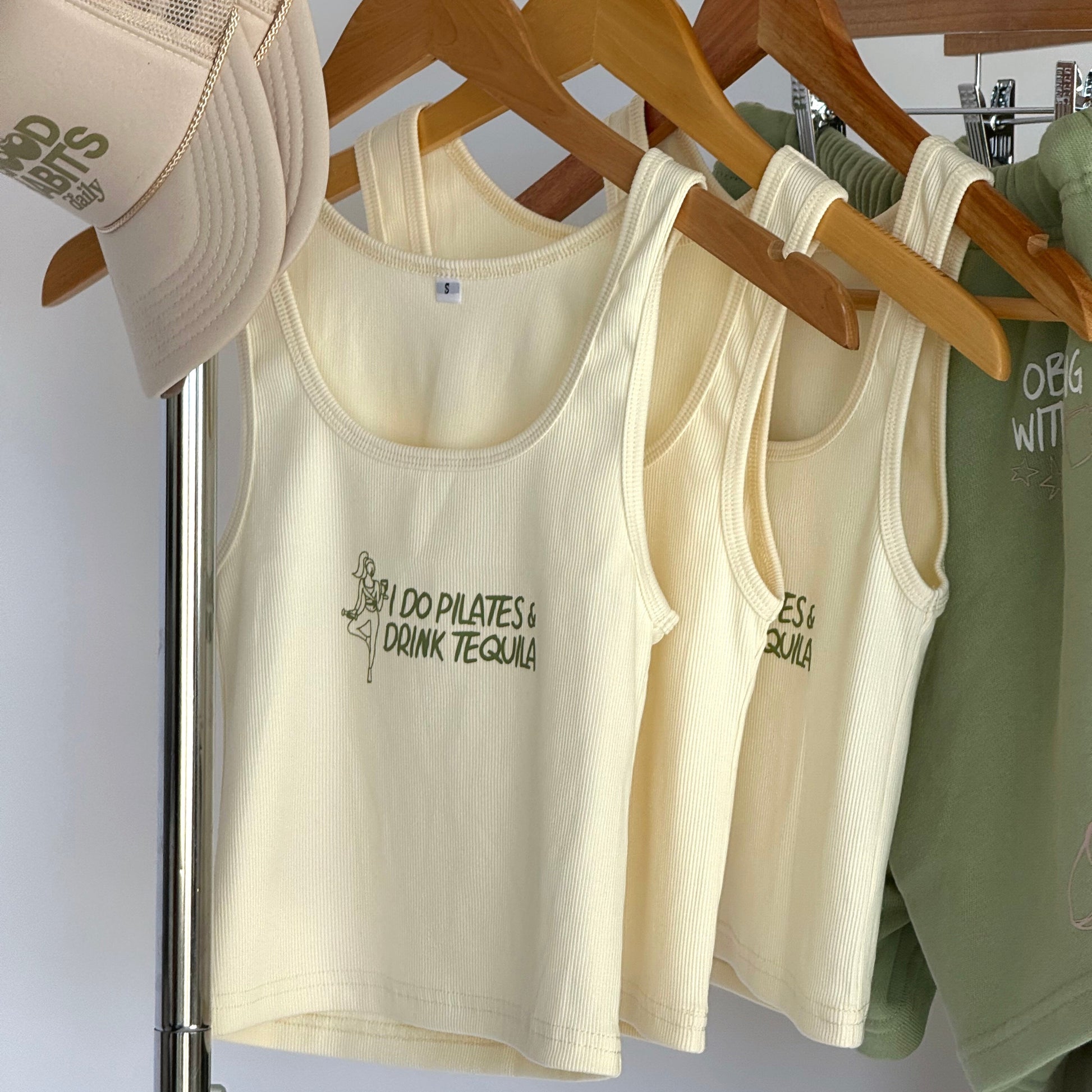 Available in green or pink handwritten messaging, “I do pilates and drink tequila” - duh!