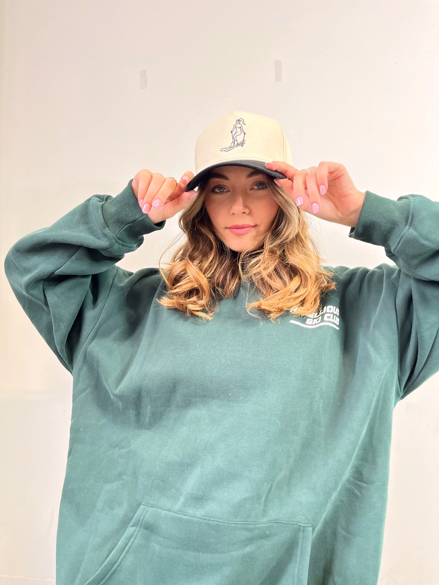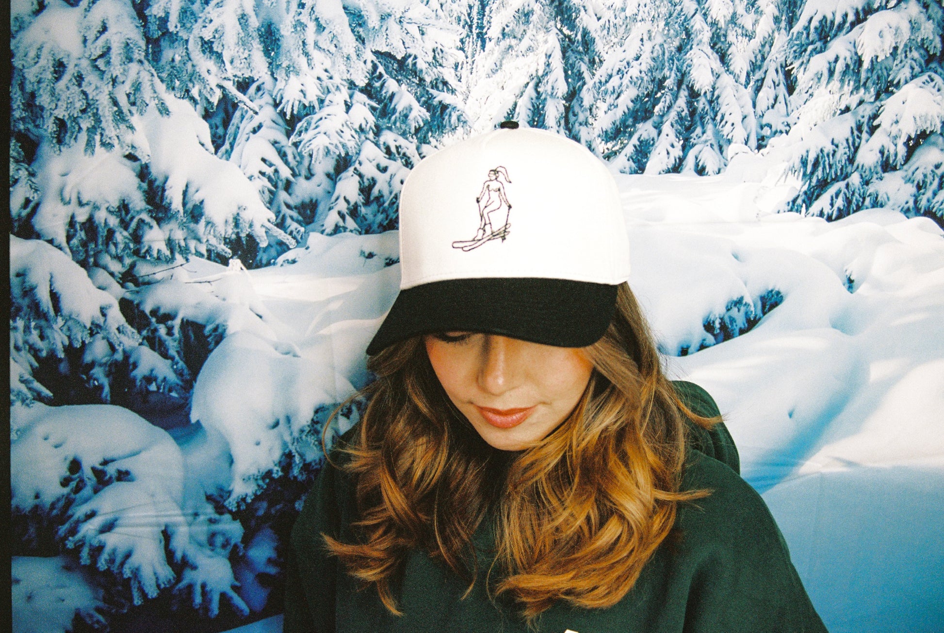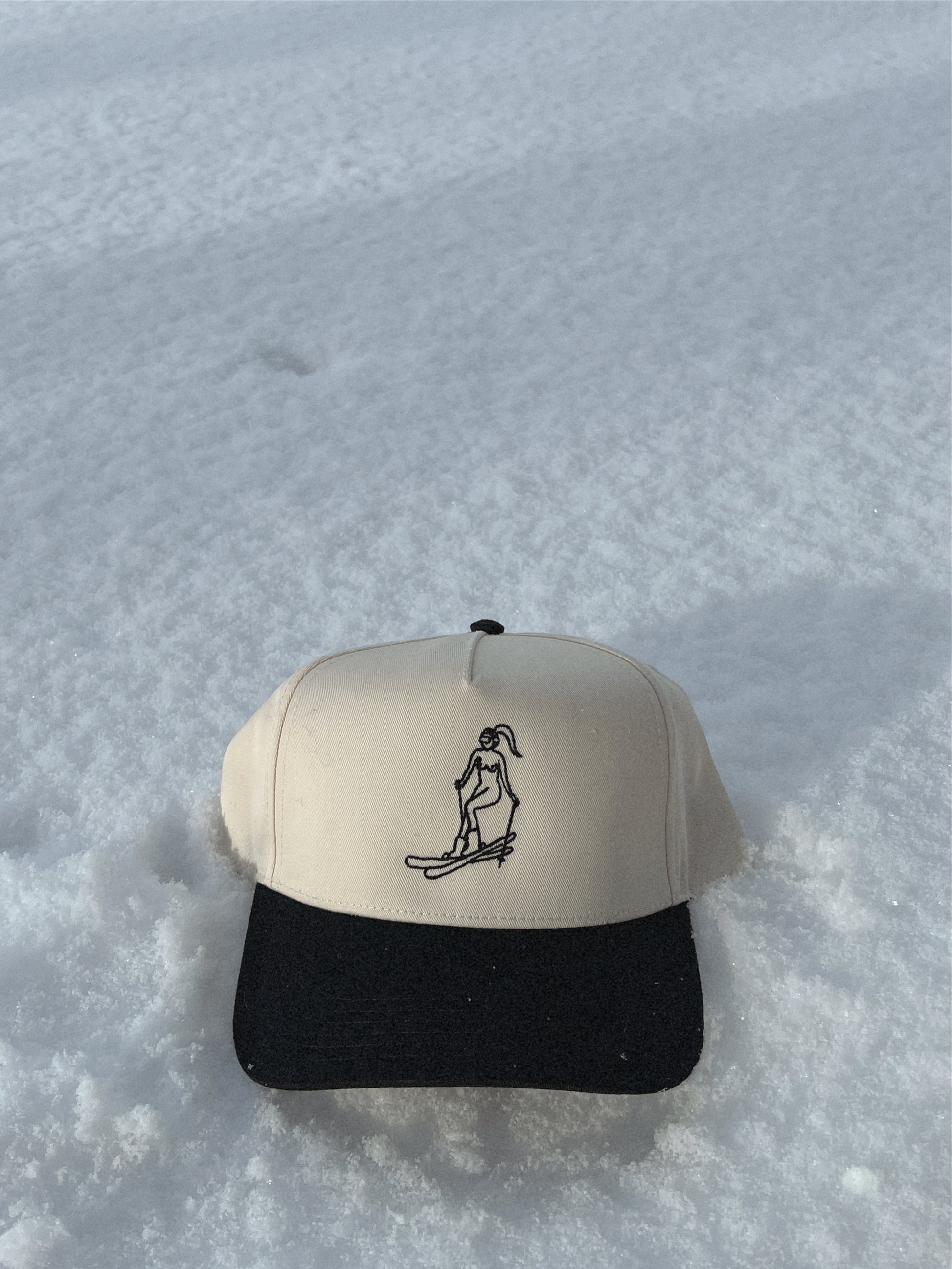 Vintage style adjustable baseball cap. Natural and navy hat, with navy printed naked ski girl on the front.