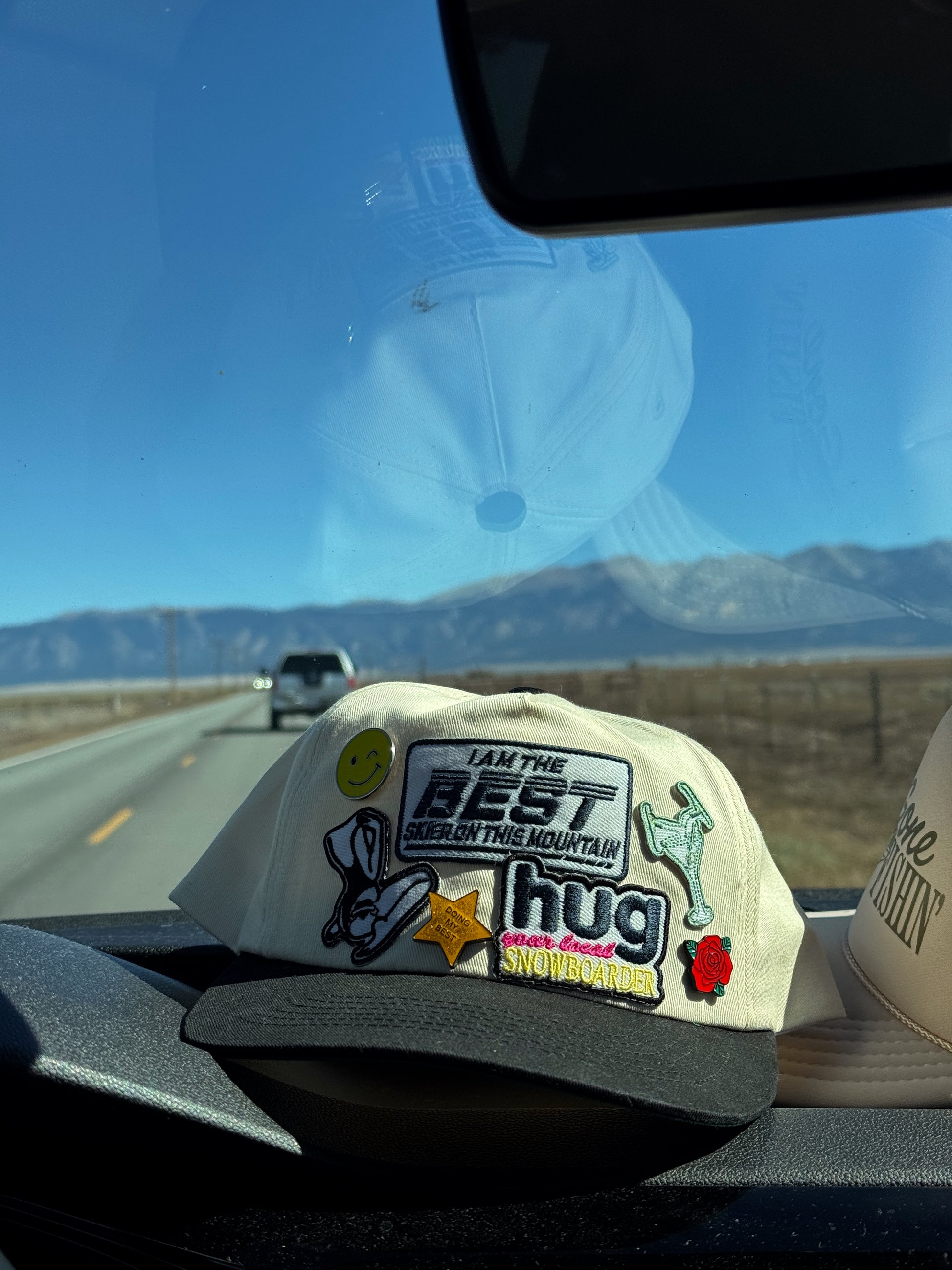 A cream and black unstructured trucker hat covered in playful mixed-media patches — “Best Skier on the Mountain,” “hug your local snowboarder,” stars, smileys, doodles, and more. Built with an unstructured 5-panel design, pre-curved brim. Loud, fun, and made for the ones who take skiing seriously… and themselves not at all.