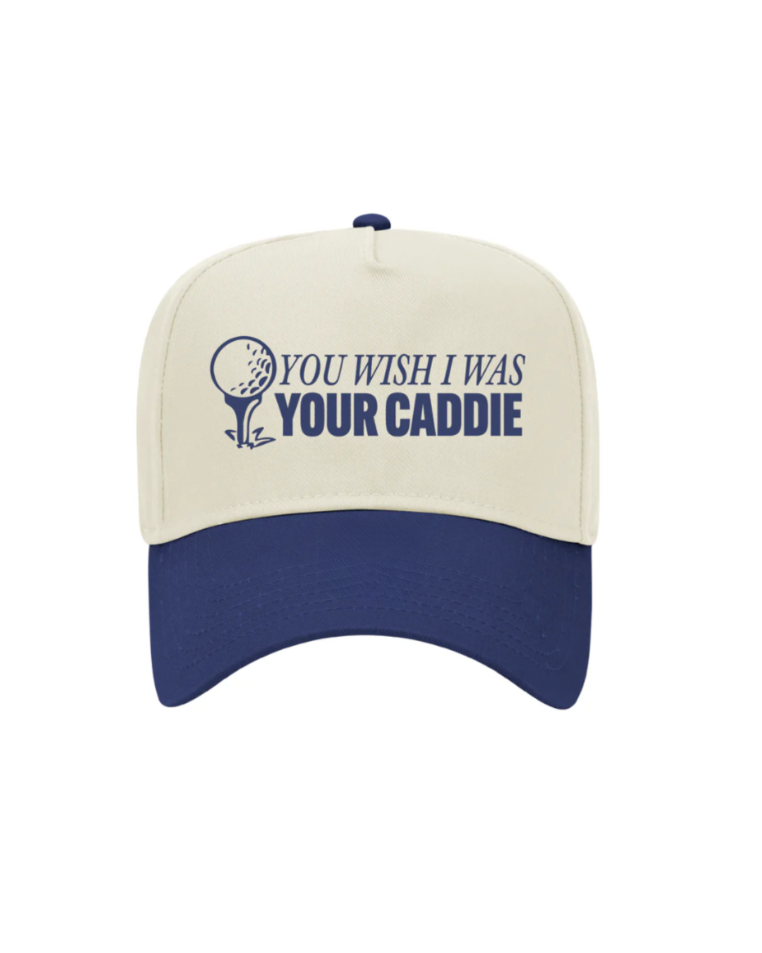 Cream and navy meet peak sarcasm in the “You Wish I Was Your Caddie” hat. A vintage fit with embroidered wit—this one’s for the girls who know they are the main character on the course.