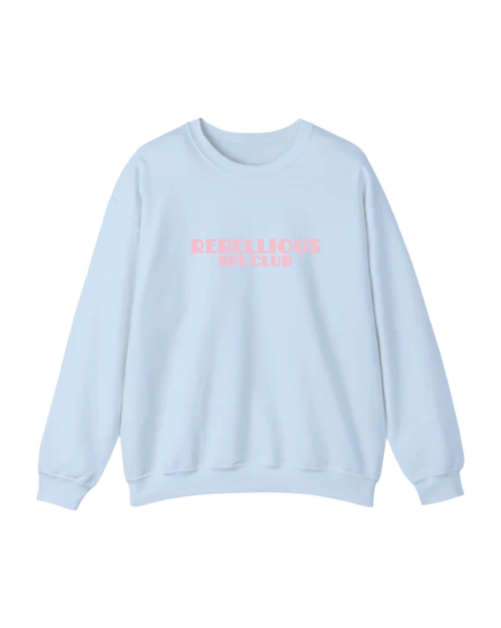 A light blue crewneck with a relaxed unisex fit and vibrant ski-inspired graphics. The front features a simple “Rebellious Ski Club” print in bubblegum pink. The back showcases a full illustration titled “The Real Housewives of Aspen,” featuring four winter-obsessed gals, set against a snowy mountain backdrop. Made from a soft heavyweight cotton blend, it’s warm, durable, and perfect for layering through the winter season.