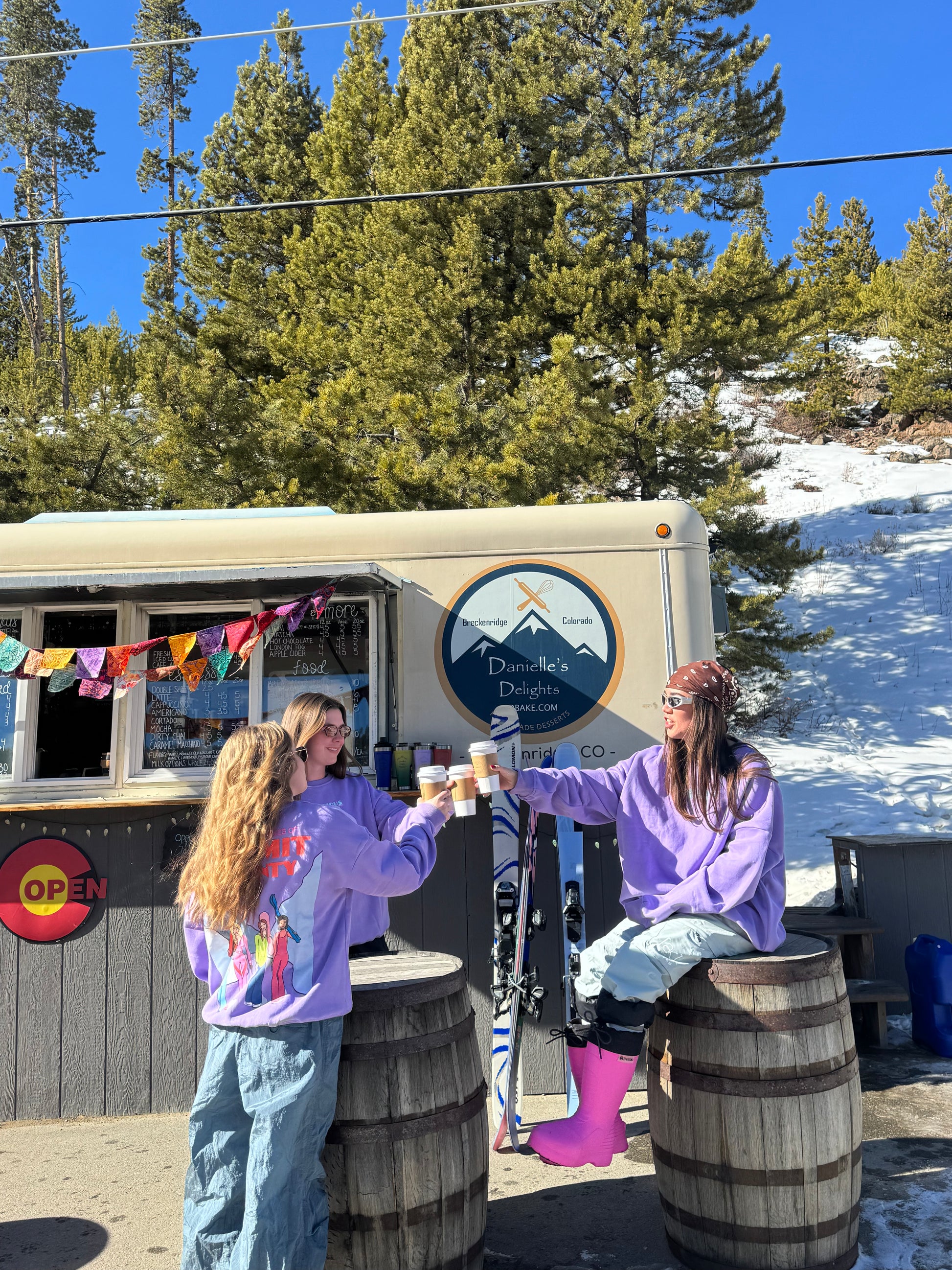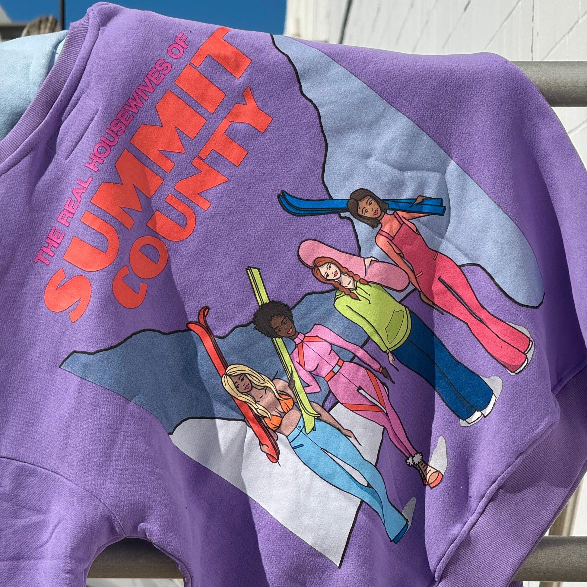 A lavender crewneck with a relaxed unisex fit and vibrant ski-inspired graphics. The front features a simple “Rebellious Ski Club” print in bright orange. The back showcases a full illustration titled “The Real Housewives of Summit County,” featuring four winter-obsessed gals, set against a snowy mountain backdrop. Made from a soft heavyweight cotton blend, it’s warm, durable, and perfect for layering through the winter season.