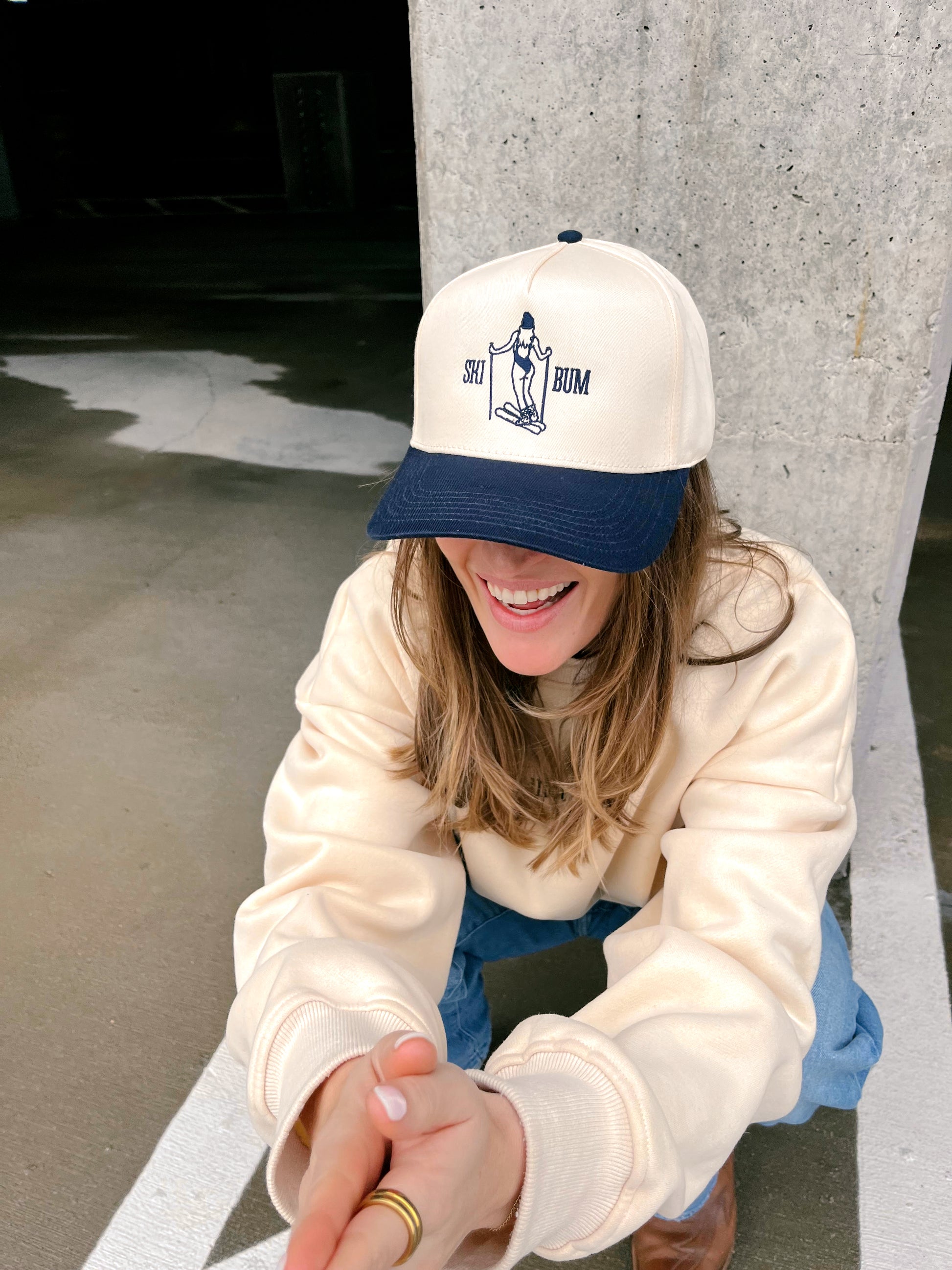 Vintage style adjustable baseball cap. Cream/off white and navy hat, with embroidered “Ski Bum” on the front.