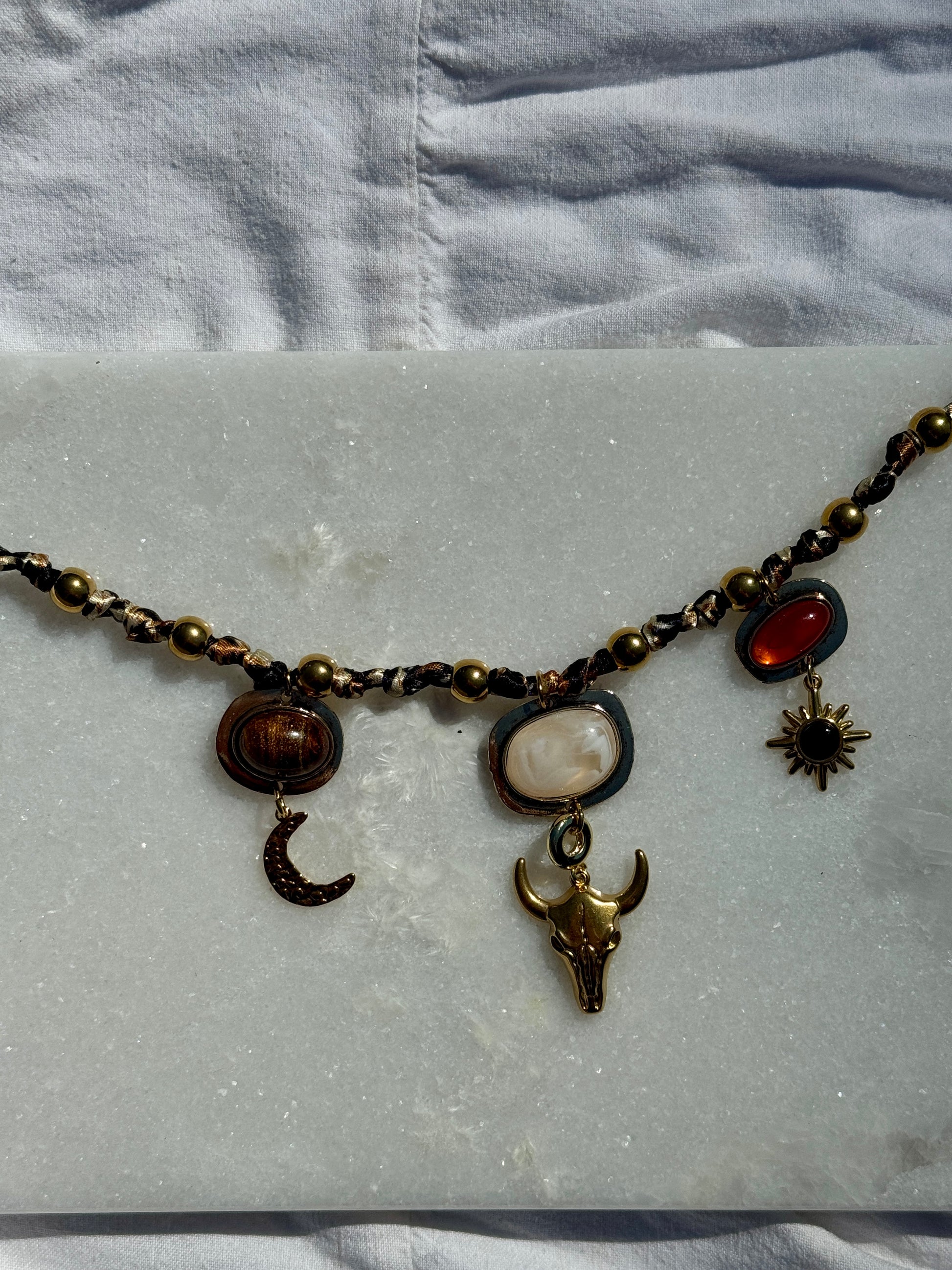 I am obsessed with this necklace. The braided leopard print fabric with three gold charms that have colorful gemstones to add a subtle pop of color. Its adjustable & 16.5 inches.