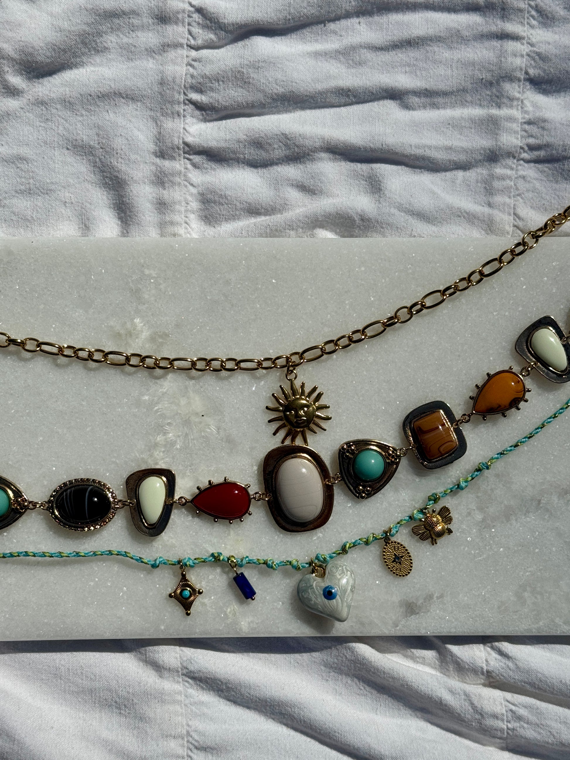 A medium thick gold necklace with a gold sun pendant, a chunky jewel toned necklace full of different shapes and textures all with a flat back so it lays nicely againt your chest, and a light blue twisted cord with fun charms hanging throughout. The gold necklace is 15.5 inches with a 2 inch extender, the chunky necklace is 16.5 with a 2 inch extender and the dainty rope is 19 inches with a 2 inch extender.