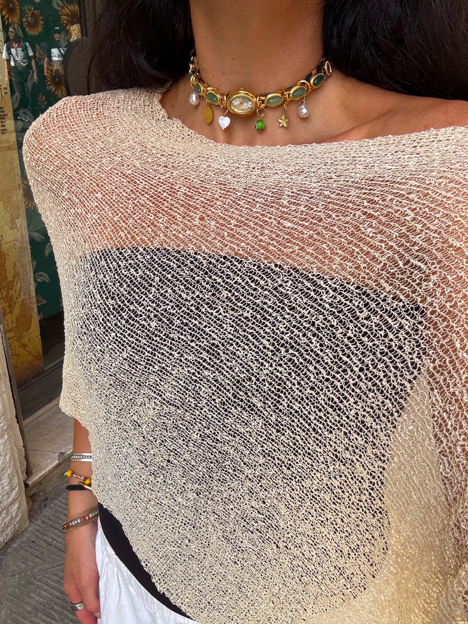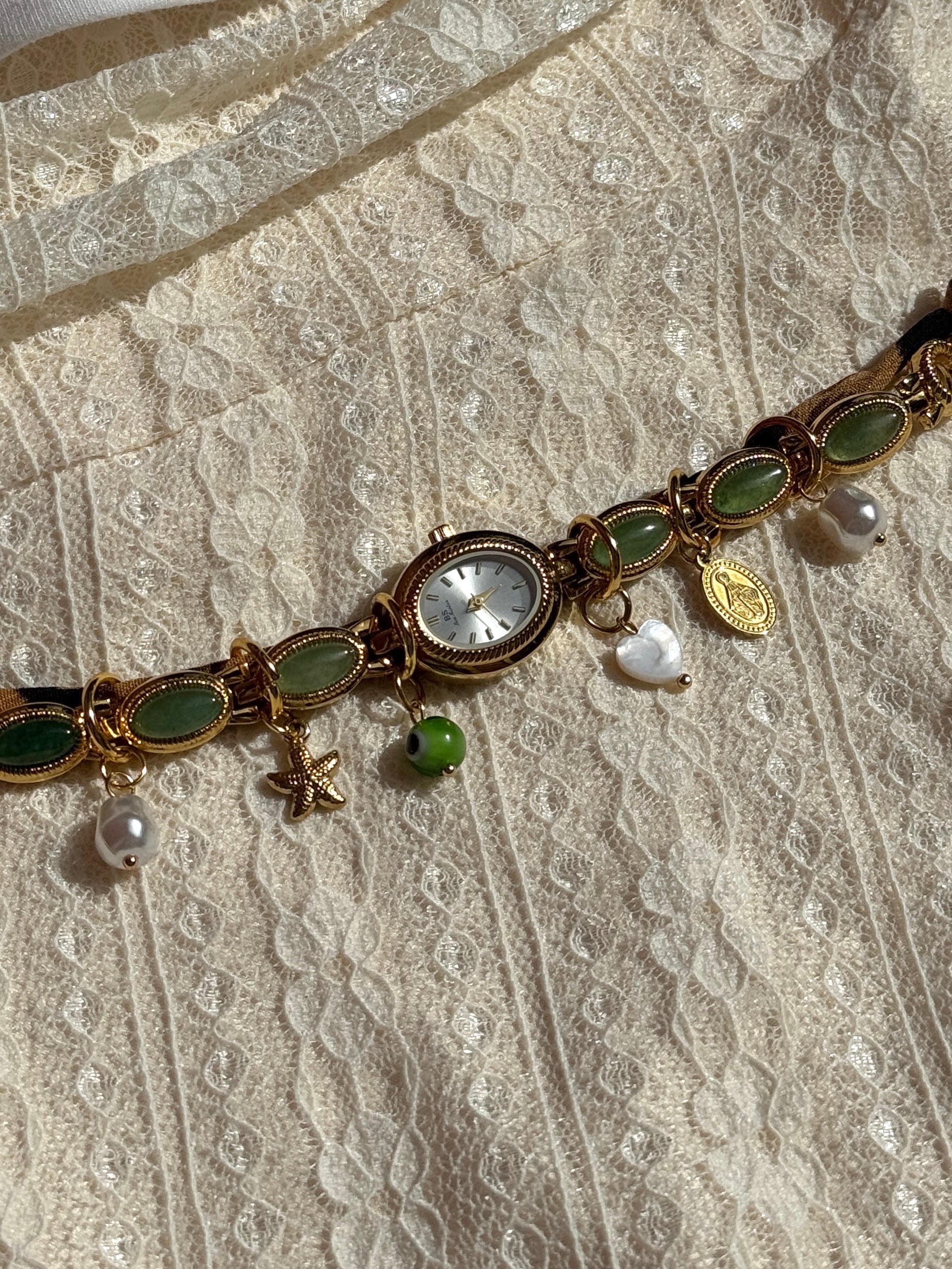 I know I’m not supposed to have favorite children, but this might be the one. A gem lined, gold watch with an ivory face, made into an adjustable choker. Each link decorated with a small charm, making it the perfect statement & accessory.