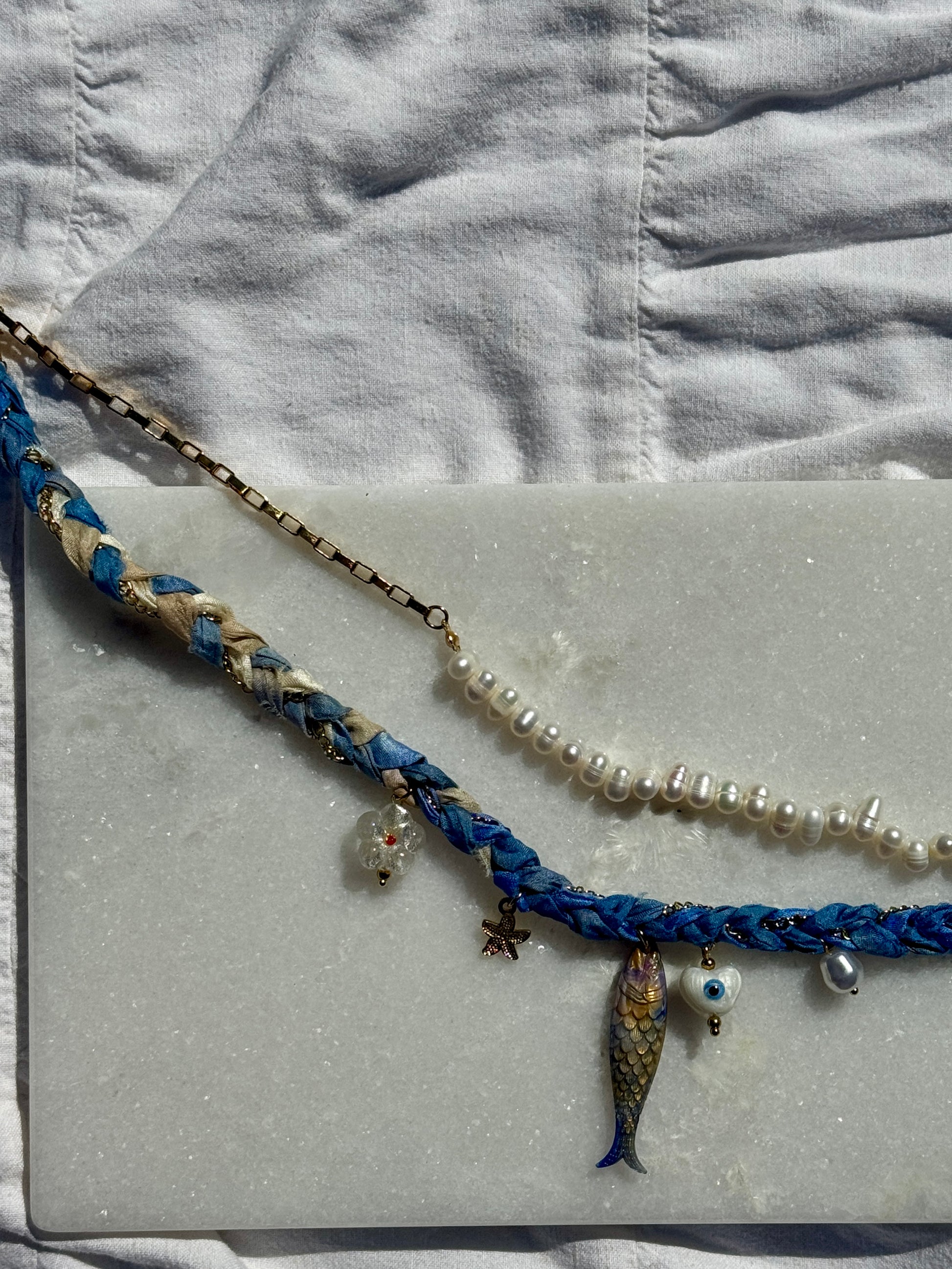 A gold and pearl chain layered with a hand braided blue vintage silk ribbon with 5 charm hanging throughout. Pearl necklace is 15 inches with 2 inch extender and the braided is 15.5 inches with a 2 inch extender.