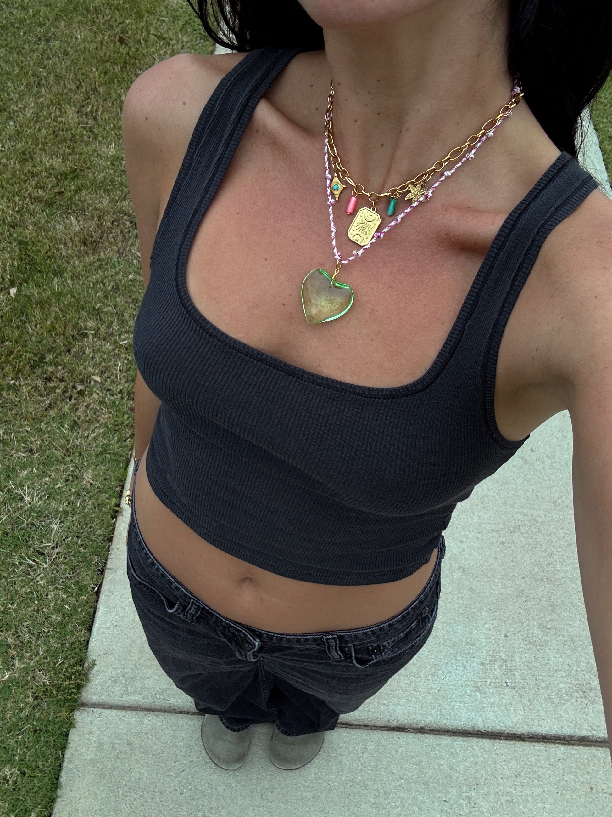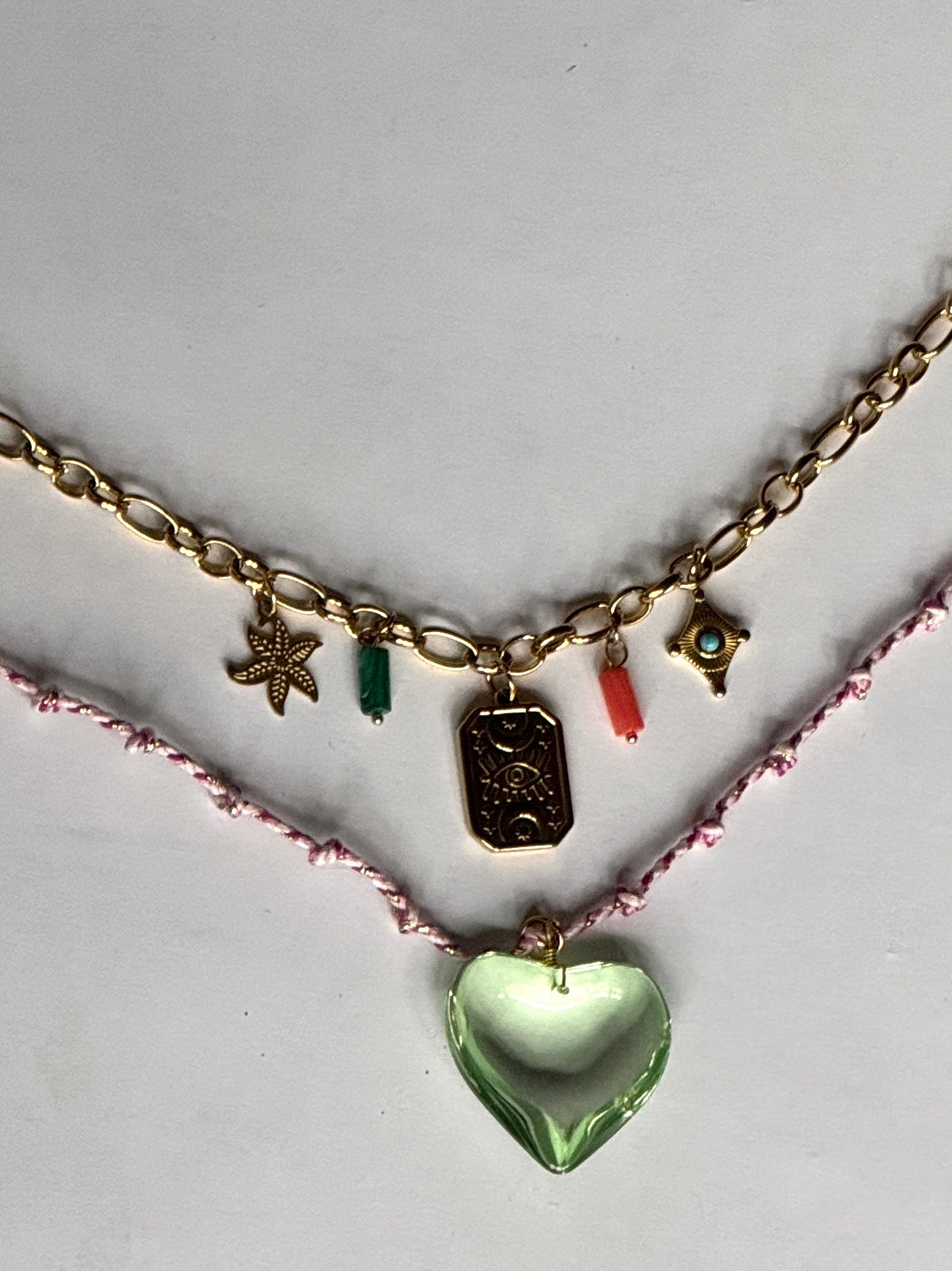 A gold chain with charms hanging from the center area paired with a purposely knotted necklace with a pale green see through heart pendant. The top necklace hangs at 16 inches with a 2 inch extender and the bottom green heart necklace hangs at 19 inches with a 2 inch extender