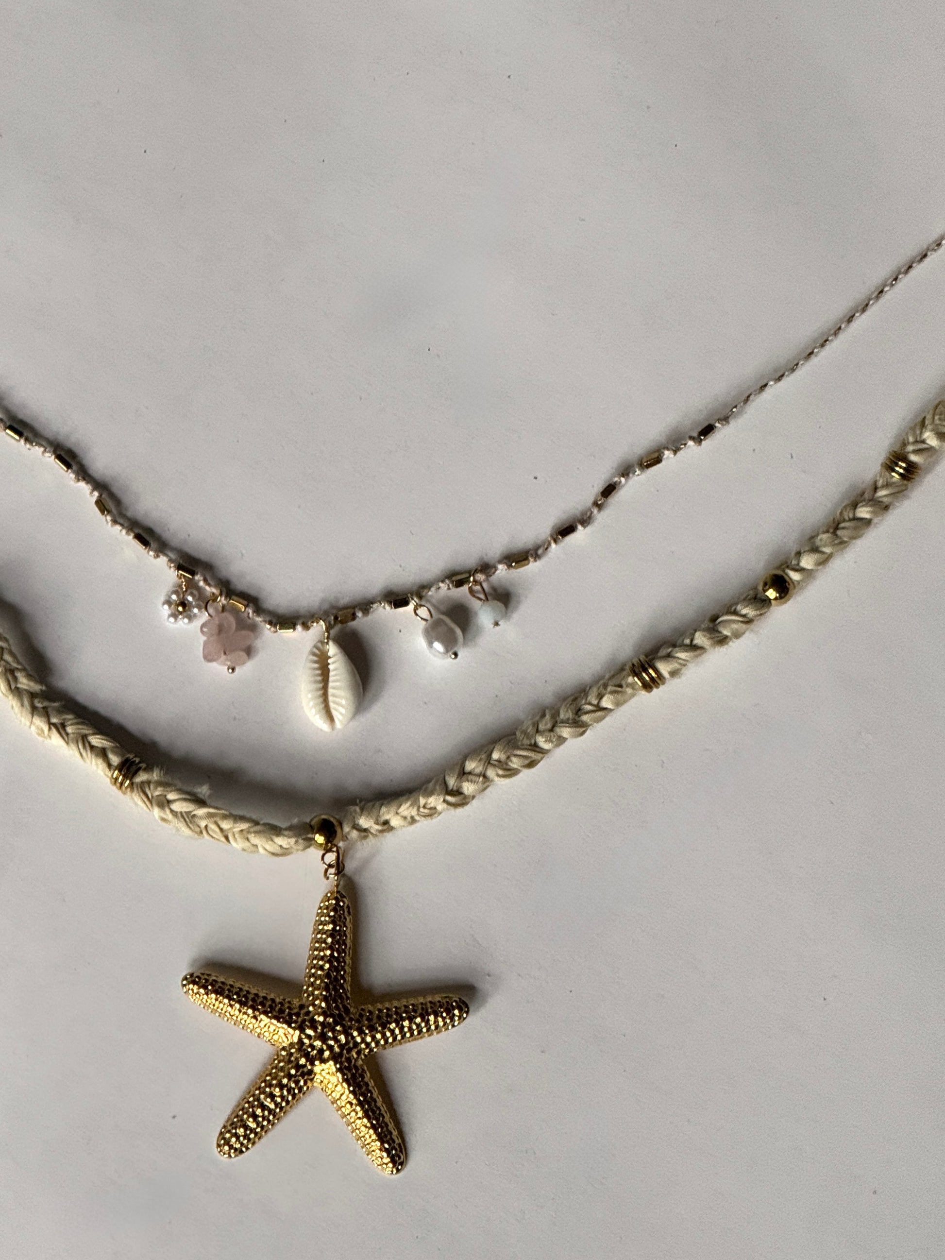 Two necklaces that compliment each other so well One chunkier tan braided with an old starfish pendant paired wihh the a minimalist thin braided necklace that has gold beads throughout and charms hanging. The starfish necklace has a length of 20.5 inches with a 2 inch extender and the thin necklace lays at 17.5 inches with a 2 inch extender.