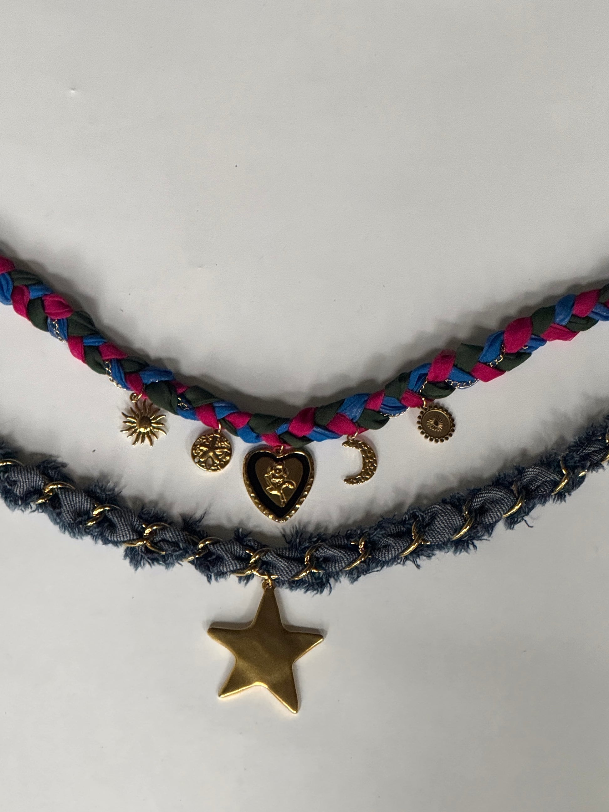 Two chunky necklaces that look just as good seperate as they do together. The first necklace is a vintage silk sari in red and blue hand braided together with charms hanging and the second necklace is a denim color threaded in a gold chain with a large star pendant. These necklaces hang at 16.5 inches with a 2 inch extender and 18 inches with a 2 inch extender.