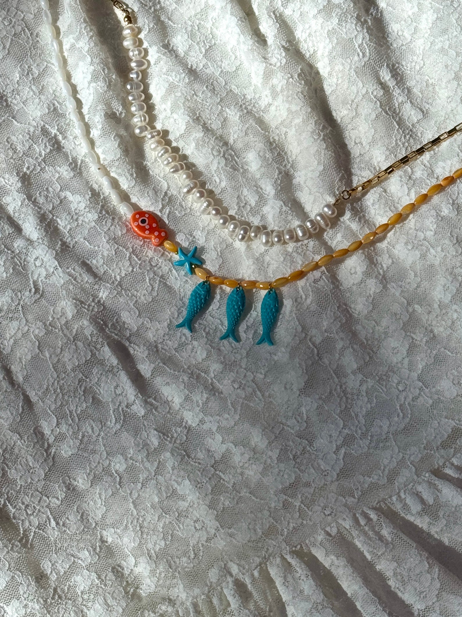 I am going to be sad to see this one go. One pearl beaded necklace with a chain towards the back, and then one mixed pearl + yellow stone neckalce with an orange fish, turquoise starfish and 3 fish charms. Pearl necklace is 16 inches with a 3 inch extender and the fish necklace is 14.5 inches with a 2.5 inch extender. Only one available, so shop now!